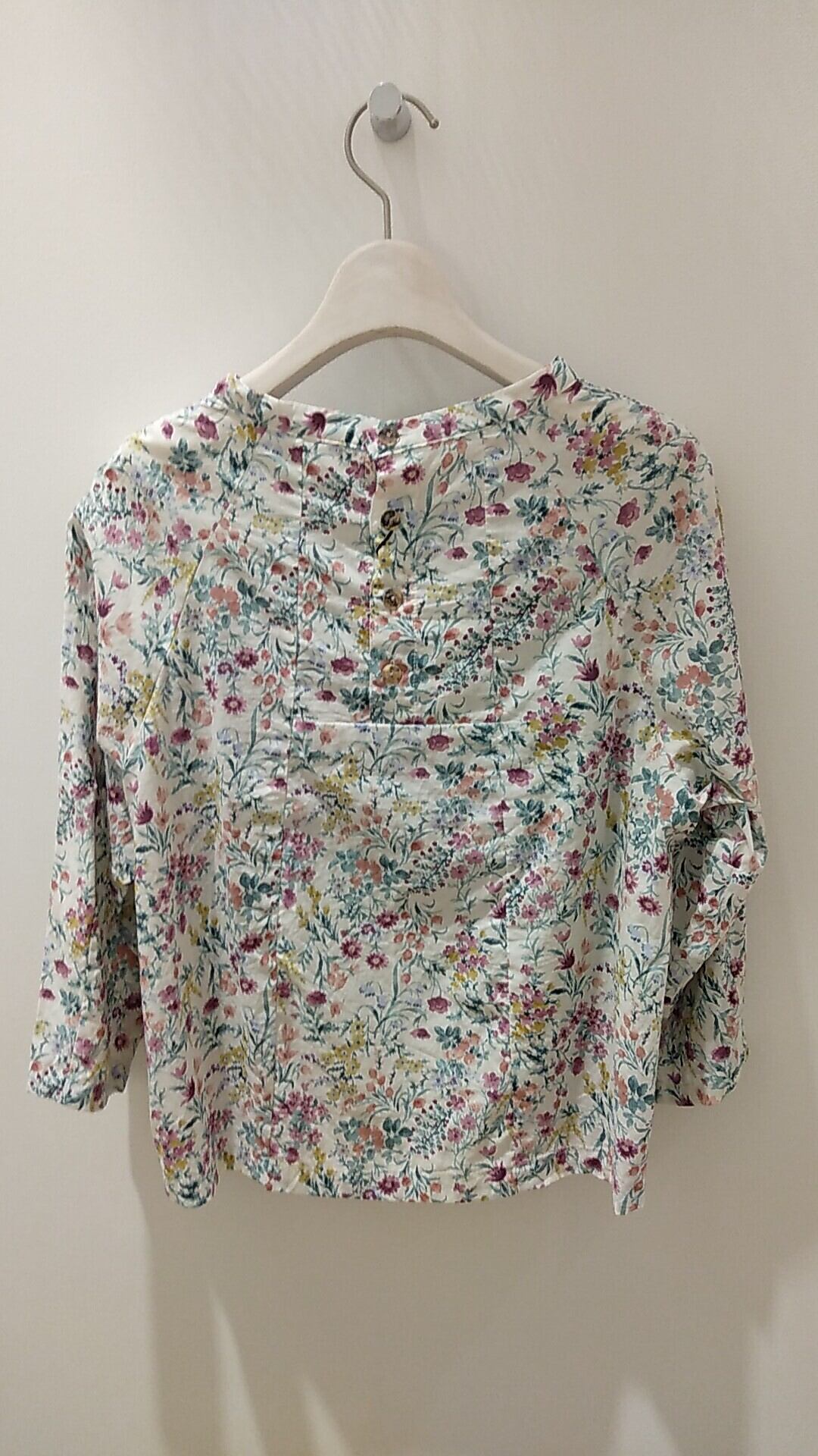 パルティクラール【KPB-3467】プルオーバーは、綿100%素材で、ちょっぴりレトロな雰囲気の水彩画風の小花柄が前面にあしらわれています。ラグラン袖や切替、背中の貝ボタンなど、凝ったディテールが魅力的。避暑地でのワンシーンを軽やかに彩ります。