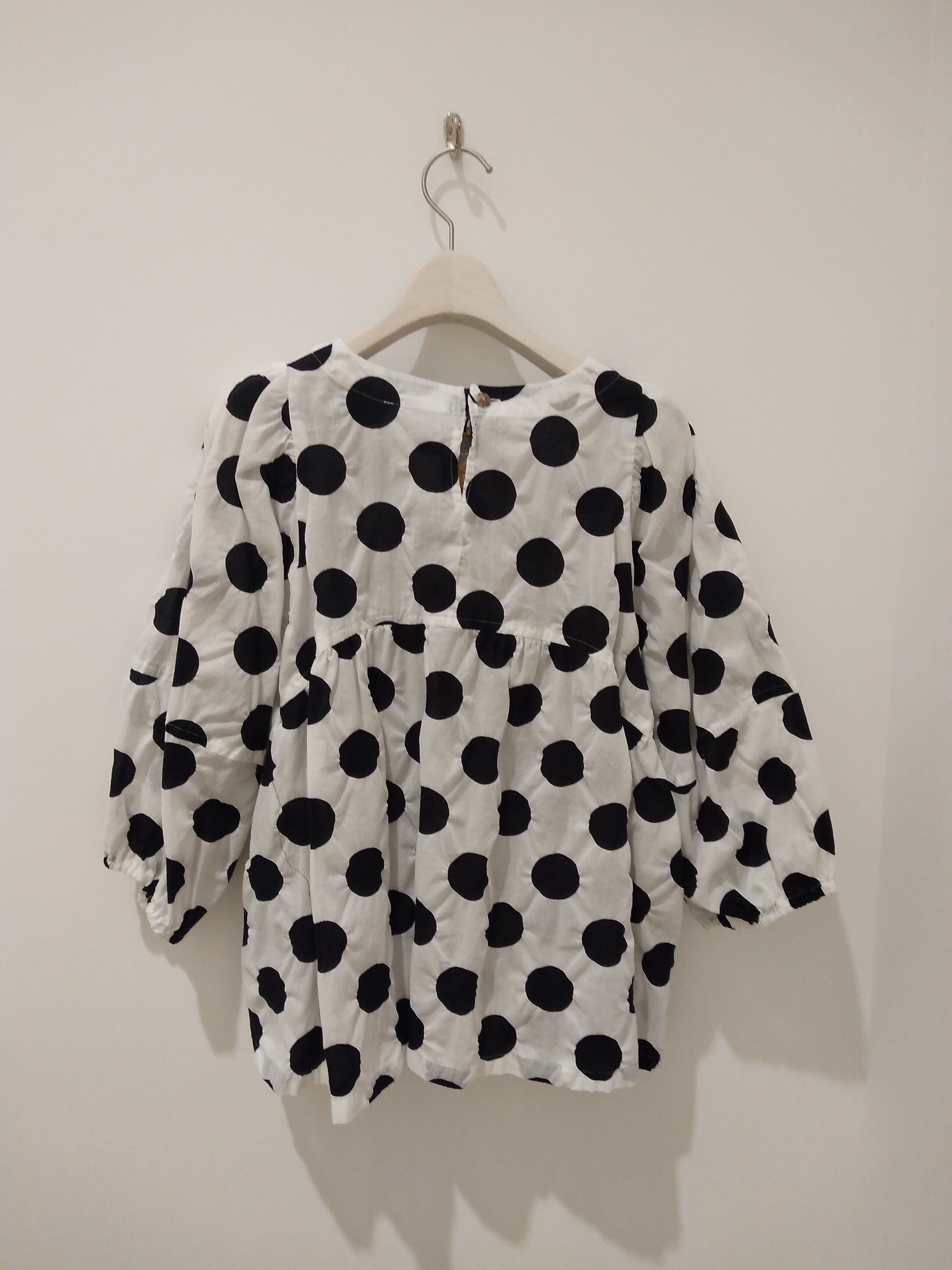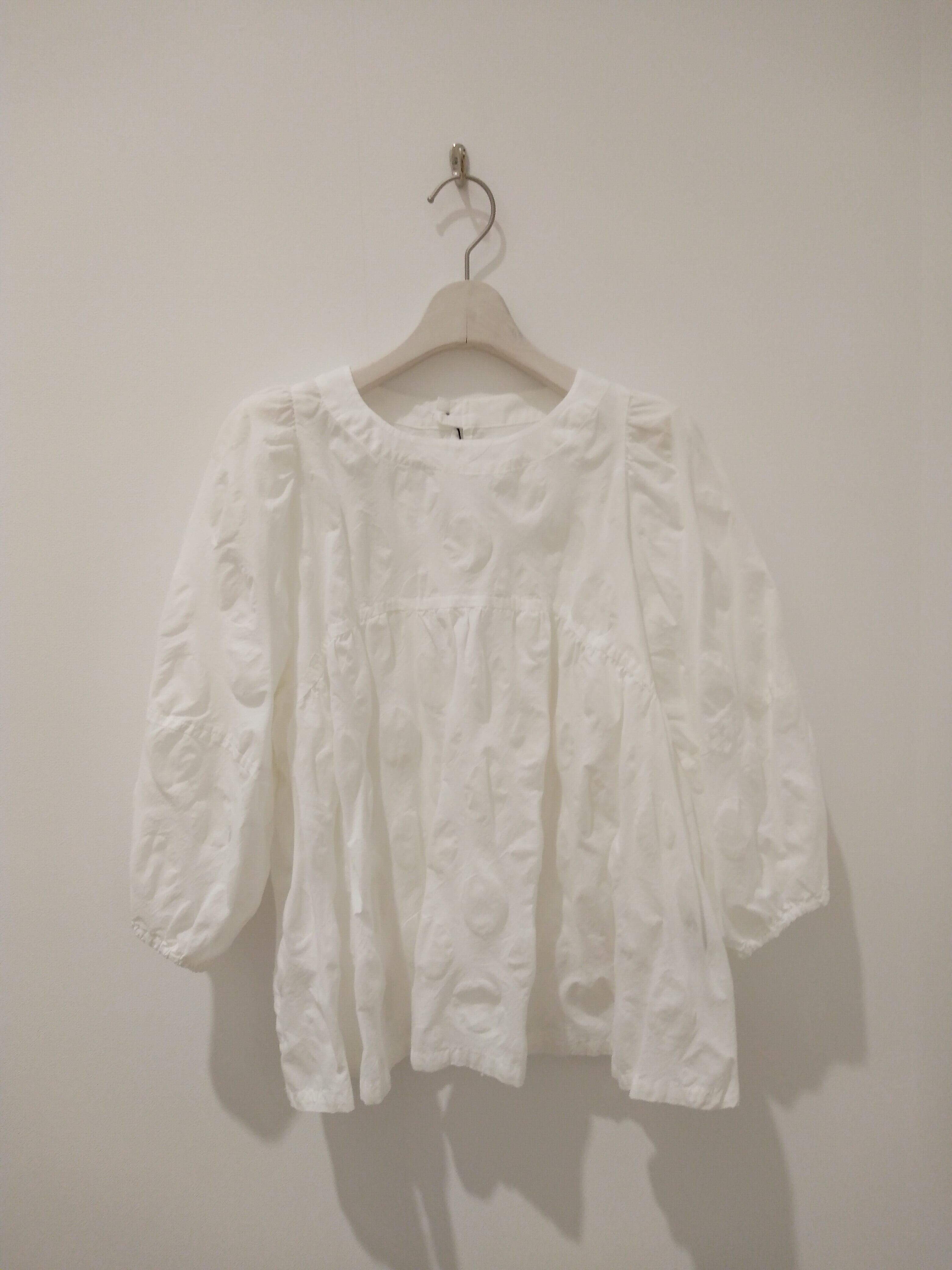 エレガントな雰囲気漂うパルティクラールのプルオーバー。ドット柄の上品なヨーク切替と、女性らしいパフスリーブが特徴的な一枚です。袖丈は七分袖なので、季節の変わり目やオフィスカジュアルにも対応できる便利なアイテムです。